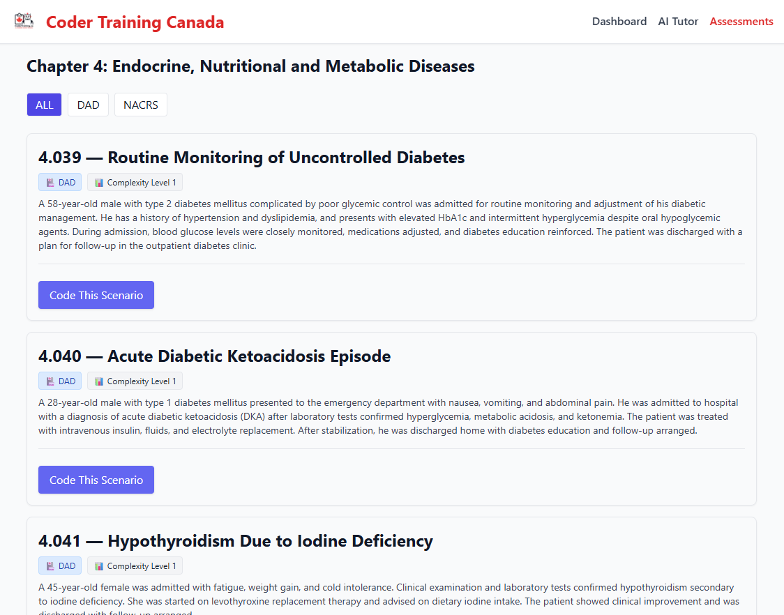 Build your coding competence with NACRS and DAD case scenarios. Practice coding diagnoses and interventions in a guided environment.